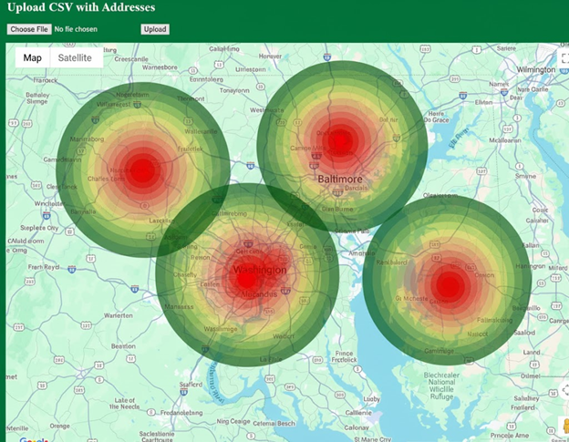 The result is a single HTML file that can be used on any computer. Staff simply export a CSV of patient addresses from GBMC’s system, remove identifying information such as names, load the file into the tool, and within minutes a new heatmap is generated using Google’s mapping capabilities.